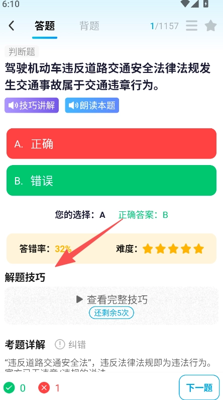 3、答题辅助工具进一步完善,通过技巧讲解与考题详解,助力学员更深入地理解驾考题目所涉及的知识点。