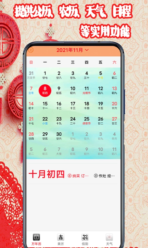 日历与黄历呈现:包含公历、农历、星期、节气等详尽内容。