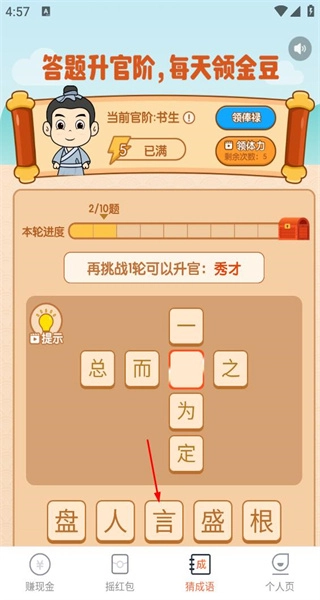 答题后本轮进度为完成二题,总共十题,需从下方选取“言”字填入对应的空格,继续进行答题。