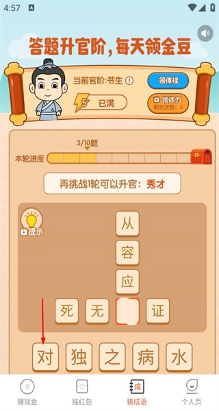 答题后本轮进度为三题完成,总共十题,需要从下方选择正确的字填入对应的空格,继续挑战。