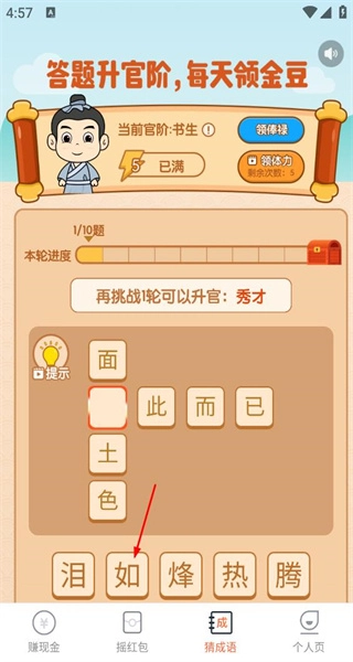 完成首题后,本轮进度为一题完成(共十题),请从下方选择“如”字填入对应空格以继续闯关。