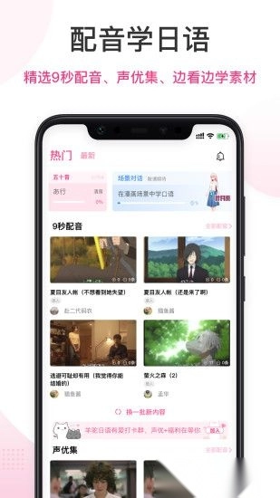 配音素材包含三大类别:9秒快速配音、精选声优集以及边看边学;在细分内容上,覆盖了日漫、日剧、综艺、歌曲、新旧番剧等热门领域;配音场景多样且灵活,还有知名声优参与互动环节。