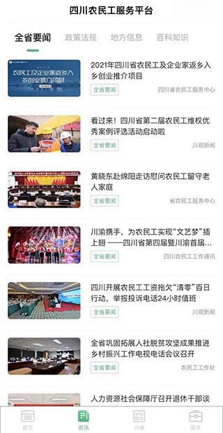 包含全省要闻、政策法规、地方信息、百科知识。第一时间获取农民工相关的资讯,了解最新政策。