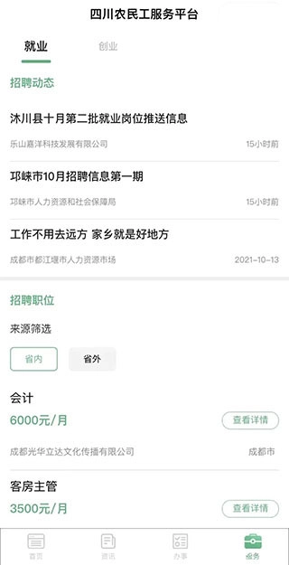 具备就业与创业服务功能,就业板块支持查看各地招聘动态,还能通过筛选功能查找省内外岗位信息;创业服务板块则可浏览优质返乡创业项目的相关介绍。