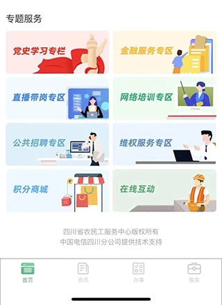 四川农民工服务平台设有专题服务、资讯服务、办事服务、就业创业服务四大板块,能帮助农民工朋友们更及时知晓身边动态,更便捷地办理各项事务。