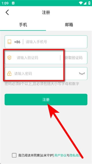 4、填写验证码并设置密码,勾选相关协议后点击注册按钮,即可完成注册流程。