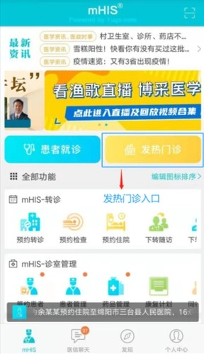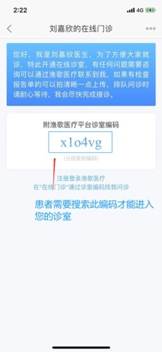 患者可以通过您分享到朋友圈的页面链接、发送至微信群聊的消息等途径查看相关信息,之后打开渔歌医疗App,在发热门诊板块搜索您专属且唯一的平台诊室编码(编码支持直接复制粘贴),就能直接进入您的诊室。