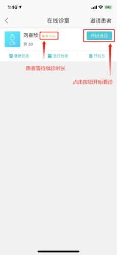 患者进入在线诊室后便进入候诊状态,此时您可在在线诊室的列表里查看该候诊患者的相关信息,像姓名、年龄、候诊时长等,点击患者信息栏上的“开始通话”按钮,就能通过音视频沟通的方式为该患者看诊。