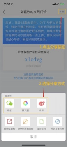 您可以点击页面右上角的分享按钮,将在线门诊页面分享至微信患者群、朋友圈、微博主页,也能直接复制链接分享,让大家知晓您已开展在线门诊业务,可通过渔歌医疗App进行线上就诊。
