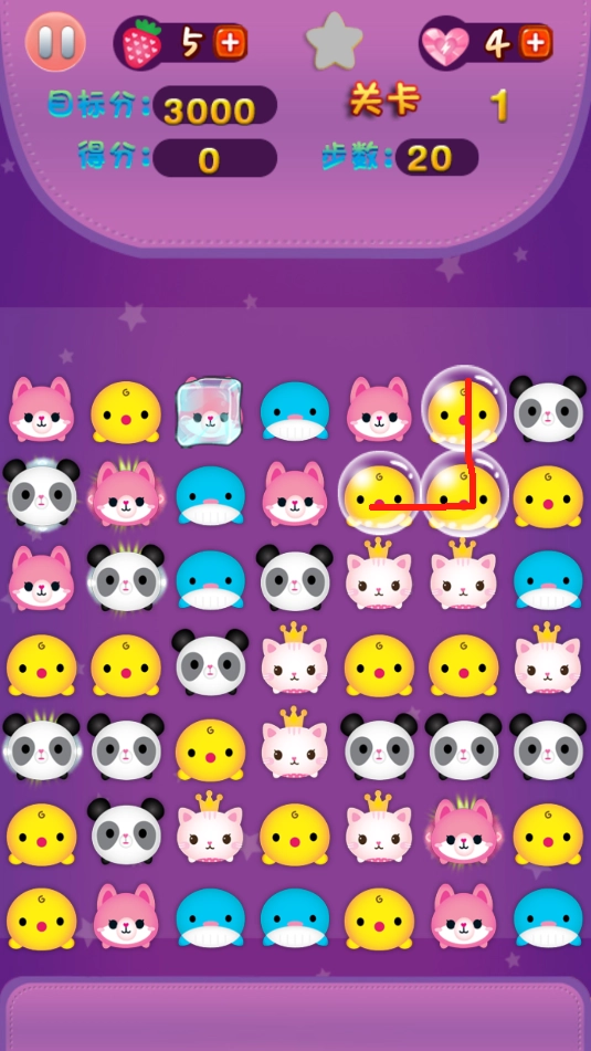 游戏里,通过点击滑动的方式连接相同的动物进行消除就能获取分数,在20步之内,只要达到3000分就能顺利通关。