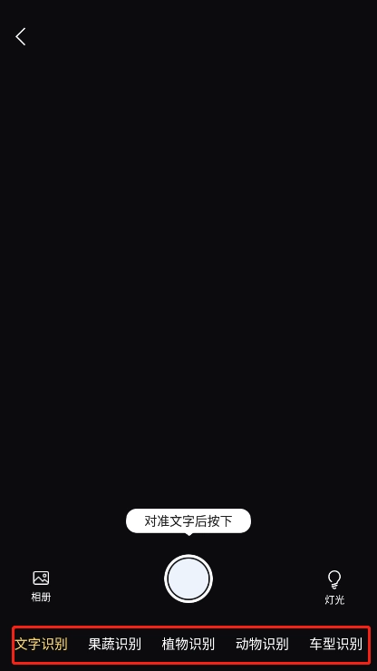 我们可以点击首页的文字识别功能,对准文字后按下中间按钮就能直接识别;下方还有果蔬、植物、动物、车型等识别功能,点击即可切换,操作方式和文字识别功能相同。