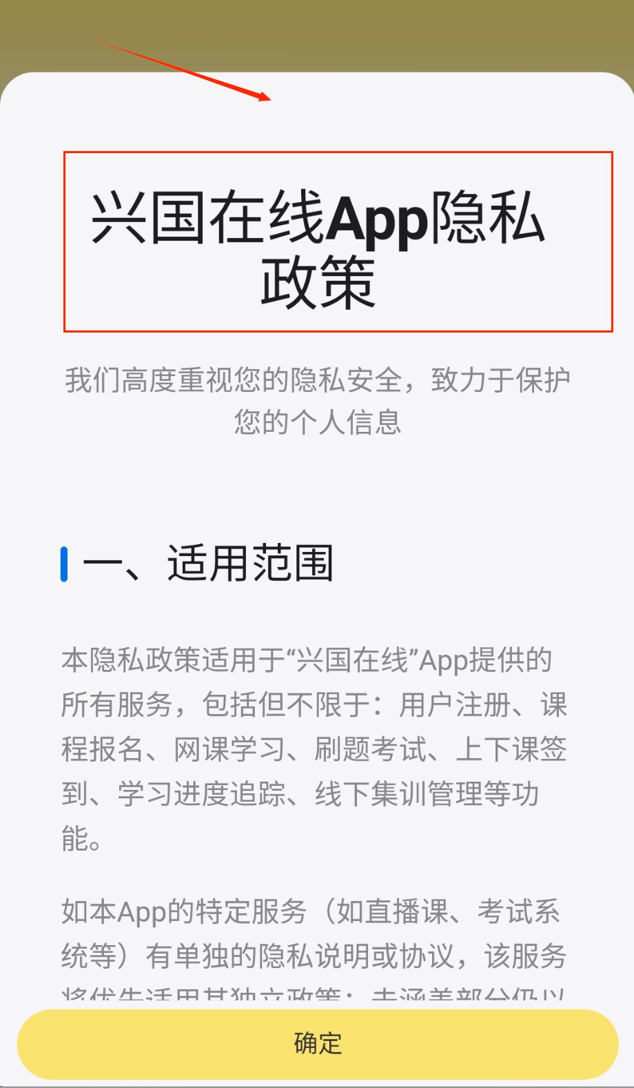 1、首次打开应用会弹出隐私政策窗口,上方清晰标注兴国在线隐私政策标题,下方详细说明个人信息保护范围与适用场景。