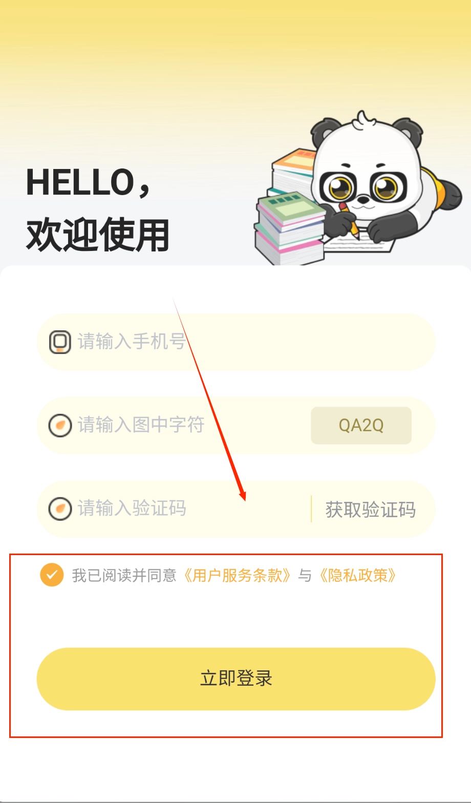 3、新用户登录时会看到温馨的熊猫欢迎界面,在渐变黄色背景上按顺序完成三步操作:输入手机号码、填写右侧显示的验证字符。