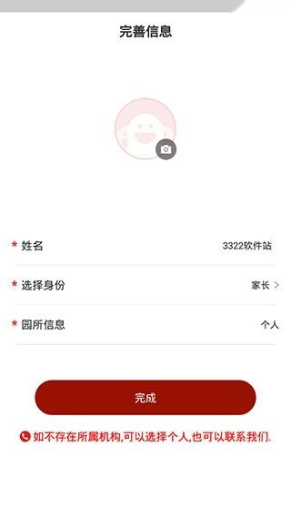 首次登录平台的用户需补充完整个人资料,若当前没有所属机构,可在园所信息栏填写“个人”。