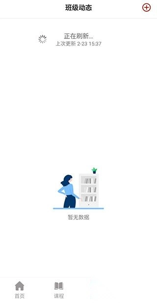 动态页面会展示用户所在班级的动态内容,下拉操作可刷新动态列表,点击右上角的+号按钮能够发布新的动态。