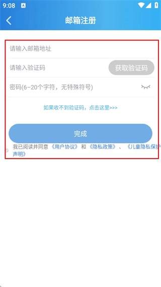 3、在邮箱注册页面填写相关信息并勾选协议后,点击完成按钮即可完成注册流程。