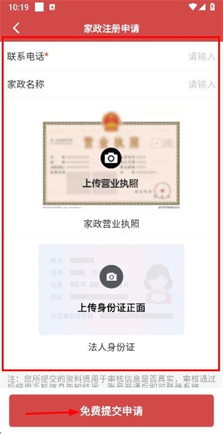 3、在注册页面填写相关信息并上传所需材料后,点击“免费提交申请”按钮即可完成注册流程。