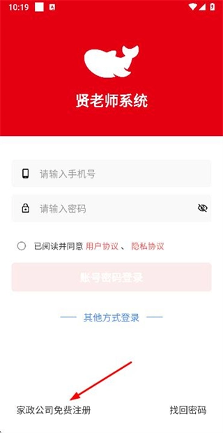 2、在登录页面找到并点击家政公司免费注册的选项,即可进入家政注册申请页面。
