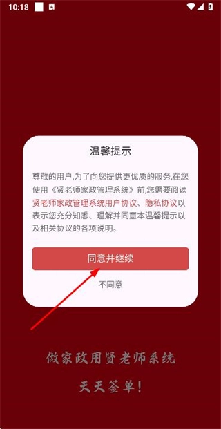 1、在温馨提示弹窗里点击“同意并继续”按钮,即可进入贤老师系统的登录页面。