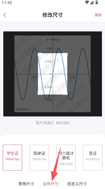 2、提供常用尺寸、证件尺寸与自定义尺寸三种选项,从多个维度满足用户在证件照尺寸调整上的各类使用需求。