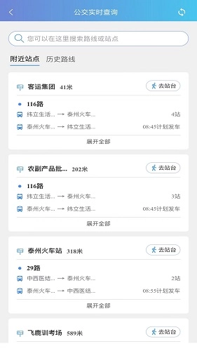 只需输入对应站点名称,就能呈现该站点的距离信息以及途经的公交线路,便于乘客换乘。