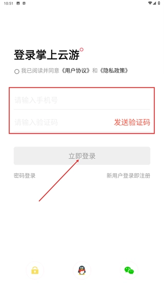 3、在验证码登录页面,勾选协议后输入【手机号】,点击【发送验证码】获取验证信息,填写后点击【立即登录】。