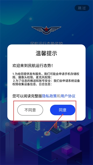 1、在【温馨提示】弹窗里,点击【同意】按钮以接受权限申请,就能继续推进【民航运行态势】平台的后续流程。