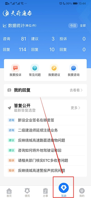 4、点击主页下方的“互动”按钮,就能在线开展咨询、投诉等操作;