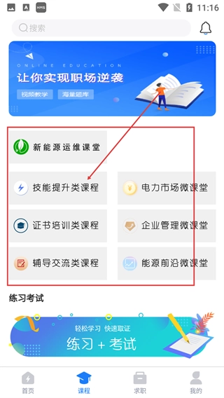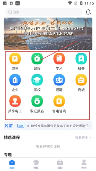 2、登录后在首页功能区,点击【课程】入口,进入课程相关页面,即可选择各类电力相关课程服务。