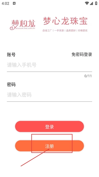 3、在【梦心龙珠宝】的登录页面,要是还没有注册账号,能够点击页面里的【注册】按钮,开启账号注册的流程。