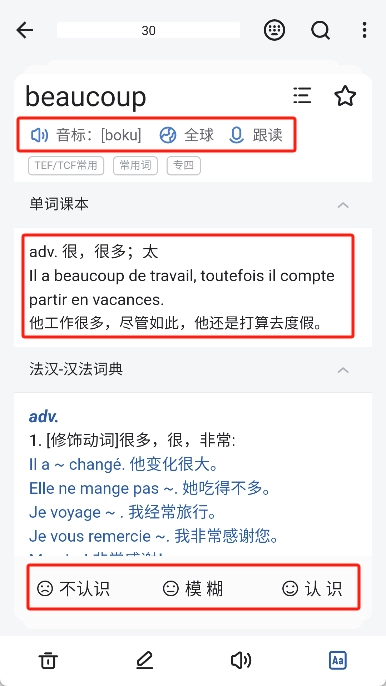 同步法语助手中的生词本背诵;提供夜间模式,保护视力。