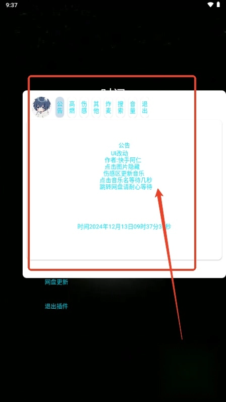 4、还可查看公告,搜索音乐,调节音量。