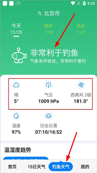 4、打开“钓鱼天气”功能,查看当天是否适合钓鱼。