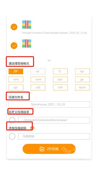 3、挑选压缩包的格式类型并设置压缩文件名,还能添加密码,之后点击zip压缩按钮就可以了