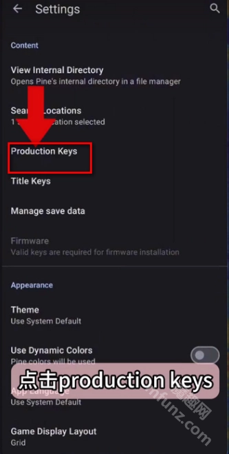 3、进入设置页面,找到production key选项并点击,然后添加密钥。