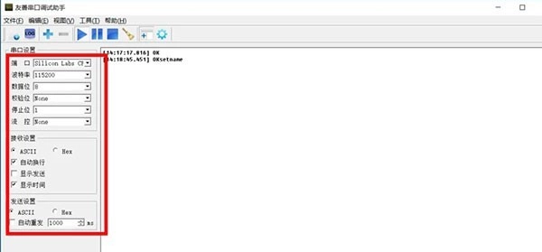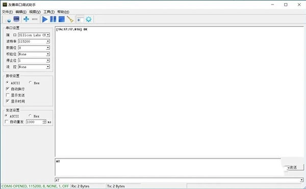 打开友善串口调试软件,开启COM口,输入AT指令并发送;若连接状态正常且硬件无故障,蓝牙串口会返回“OK”的响应信息。
