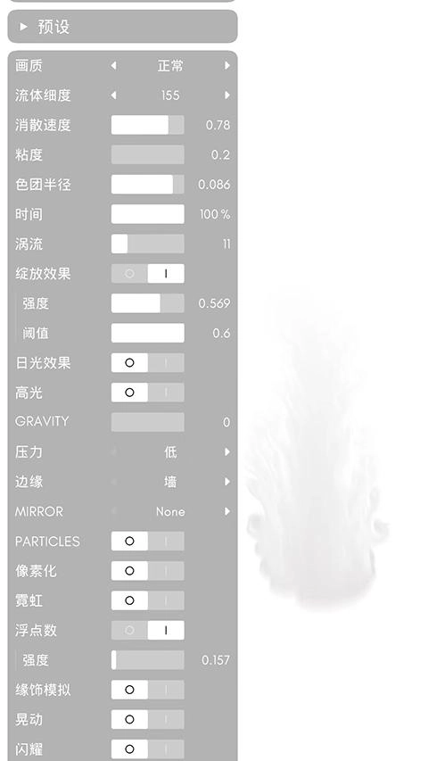 软件配备了自定义模式功能,用户能够依据自身需求对模拟分辨率、涡度、调色板、色彩等各类参数进行调整,以此打造出更具个性化的流体效果。