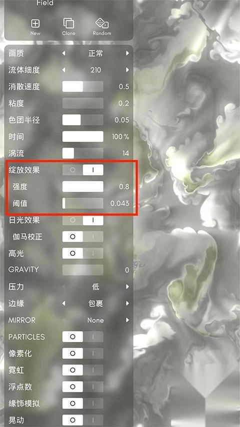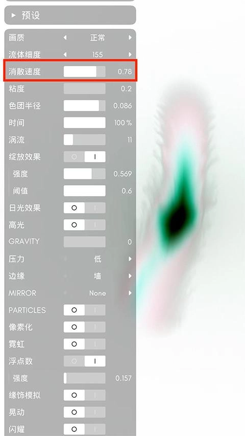 2、进入设置界面后,可对画质、流体粗细、消散速度、绽放效果以及阈值等各项参数进行调整。