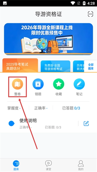 1、在【导游资格证】页面的题库板块中,找到【整卷】按钮并进行点击操作。