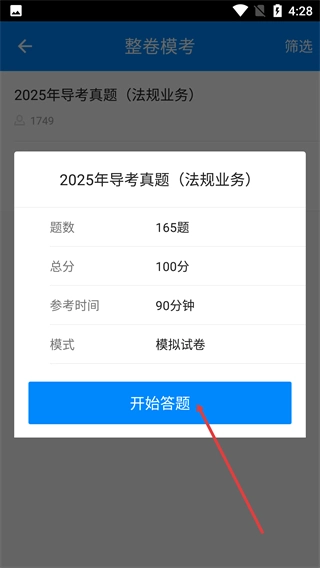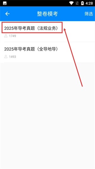 2、进入【整卷模考】页面后,可选择【2025年导考真题(法规业务)】试卷,也能依据自身需求挑选其他真题卷。