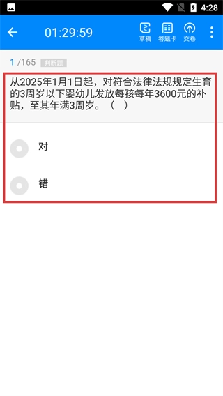 4、进入答题页面后,能看到题目内容,通过选择【对】或【错】进行作答,页面顶部还设有答题时长显示以及草稿等功能按钮。