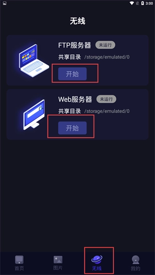 4、进入【无线】页面,找到对应的服务项(例如【FTP服务器】【Web服务器】),点击其旁边的【开始】按钮,即可启用共享功能。