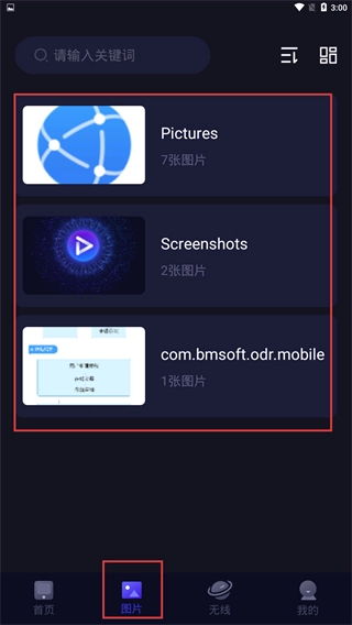 3、切换到【图片】页面,就能查看不同分类(比如【Pictures】【Screenshots】)里的图片资源。