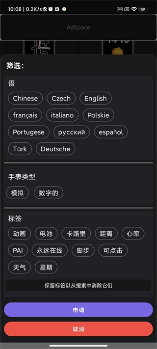 能够对动画、电池、卡路里、日期、距离、脉搏、步数、天气这些内容进行过滤。