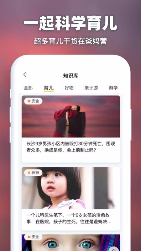 选择爸妈营,查看平台收集的育儿干货文章、资讯