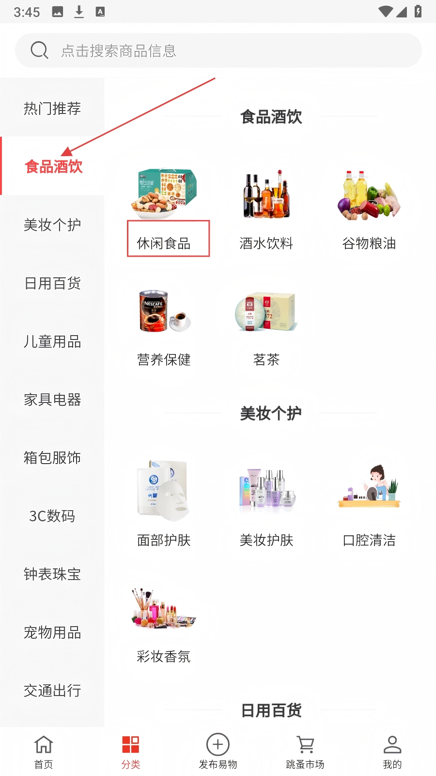 进入分类页面后,点击左侧的【食品酒饮】分类,接着在右侧选择【休闲食品】这个子分类。