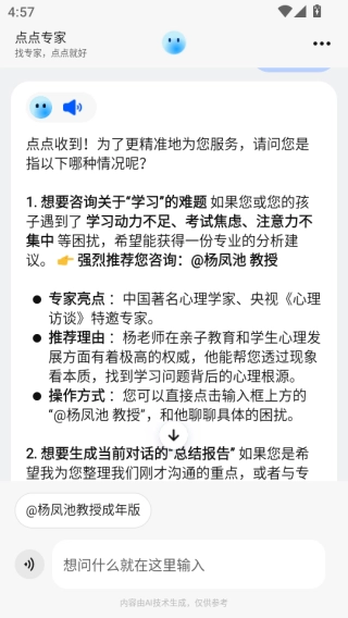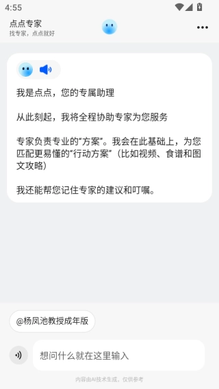 点点专家软件是一款主打智能陪伴与高效问答的全能助手软件,提供文字输入与语音转文字双模式沟通渠道,让提问无门槛、响应更即时,无论是日常琐事咨询、情感困扰倾诉,还是专业问题解答,都能获得贴心且专业的回应,丰富服务场景,搭配7x24小时全天候在线陪伴,为用户打造专属智能伙伴,支持精准问题传递、个性化方案匹配,还能联动专业领域专家资源,让用户在轻触之间就能解决各类难题。