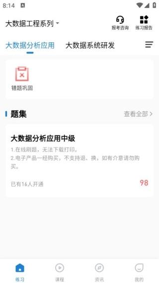 2、进入到平台首页,是可以去开启错题巩固练习,点击下方资讯进入。