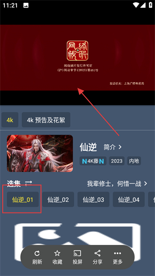 2、在4K动漫分类页面,点击你喜欢的动漫(比如《仙逆》),就能进入该动漫的播放页面。