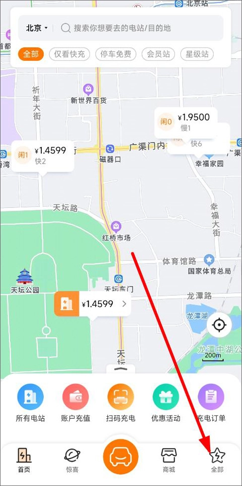 1、打开星星充电桩应用,登录后进入首页。首页会优先呈现当前定位位置的闲置充电桩,同时设有电站、账户充值、扫码充电、订单等功能栏,点击“全部”选项即可。